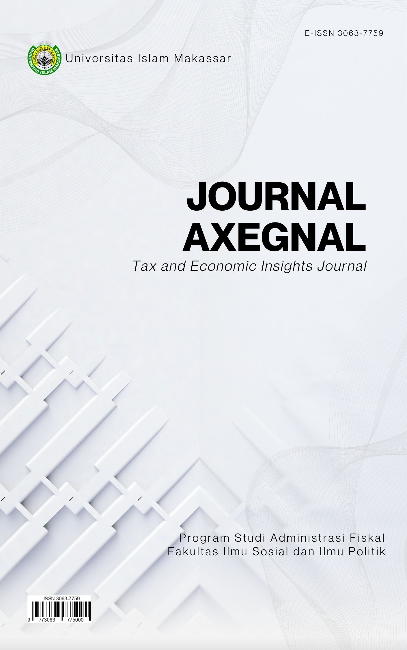 Journal AXEGNAL: Tax and Economic Insights Journal adalah jurnal ilmiah yang diterbitkan oleh (Program Studi Administrasi Fiskal, Fakultas Ilmu Sosial dan Ilmu Politik, Universitas Islam Makassar) yang memfokuskan pada penelitian dan kajian dalam bidang perpajakan, akuntansi, manajemen dan ekonomi. Jurnal ini bertujuan untuk menjadi wadah bagi akademisi, praktisi, dan peneliti dalam berbagi wawasan, analisis, dan hasil penelitian yang berkaitan dengan kebijakan perpajakan, reformasi pajak, dampak pajak terhadap perekonomian isu akuntansi dan manajemen, serta berbagai isu ekonomi lainnya. Melalui pendekatan yang beragam, AXEGNAL berupaya memberikan kontribusi dalam pengembangan ilmu pengetahuan di bidang perpajakan, akuntansi manajemen dan ekonomi, serta menjadi referensi bagi pengambil kebijakan dan pelaku ekonomi. Jurnal ini diterbitkan secara berkala dan menerima artikel dalam bahasa Indonesia maupun Inggris.
